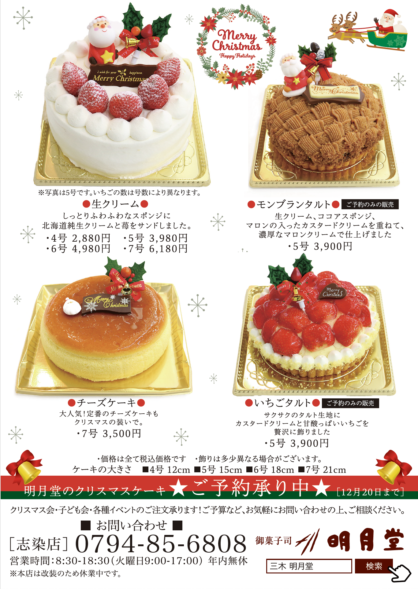 明月堂ではクリスマスケーキのご予約を承り中です!